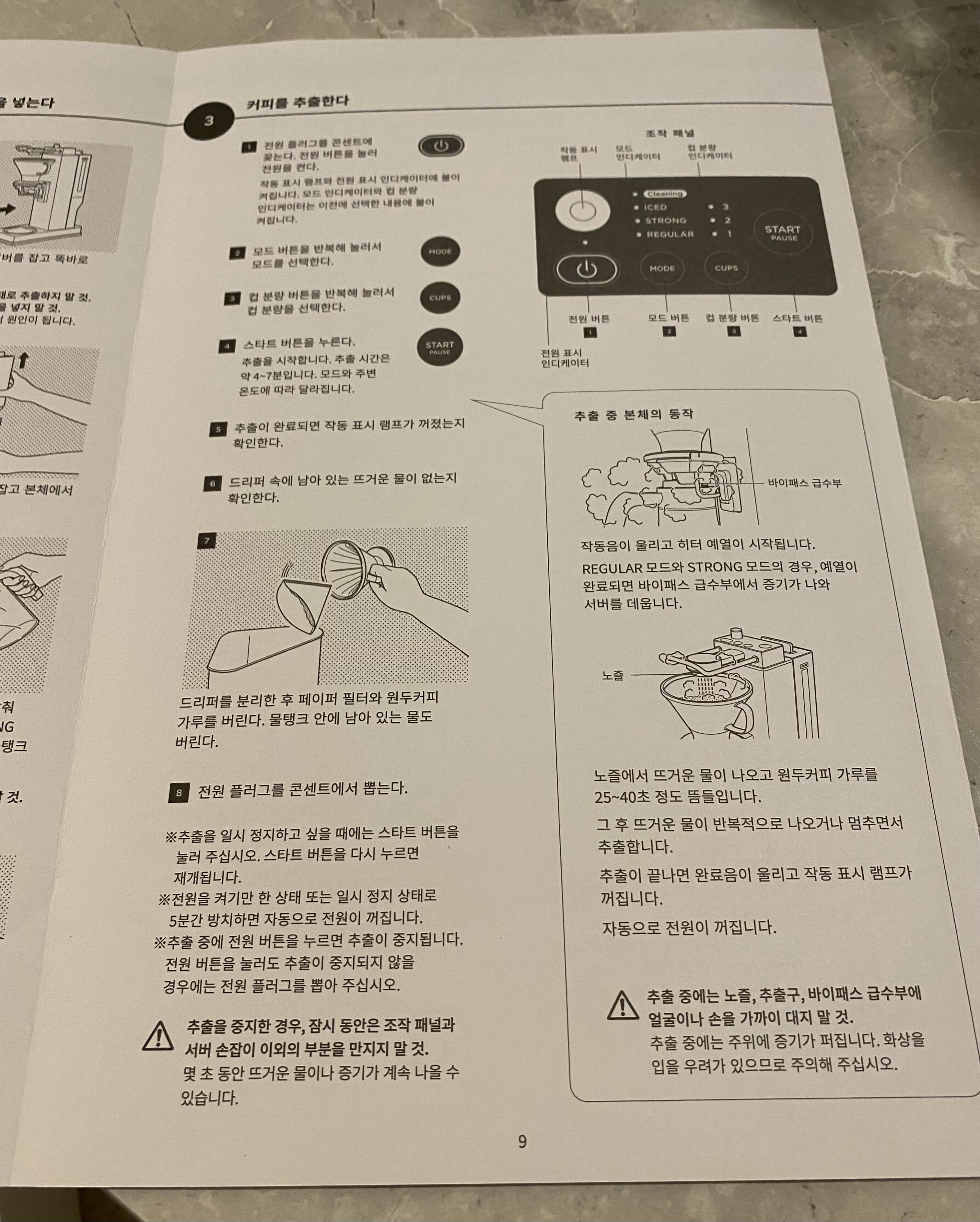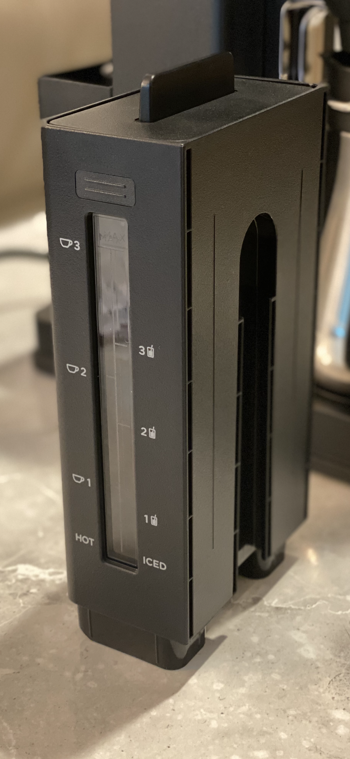 물탱크에는 3잔의 따뜻한 커피 혹은 아이스 커피를 만들 때 필요한 양이 표시되어있다.