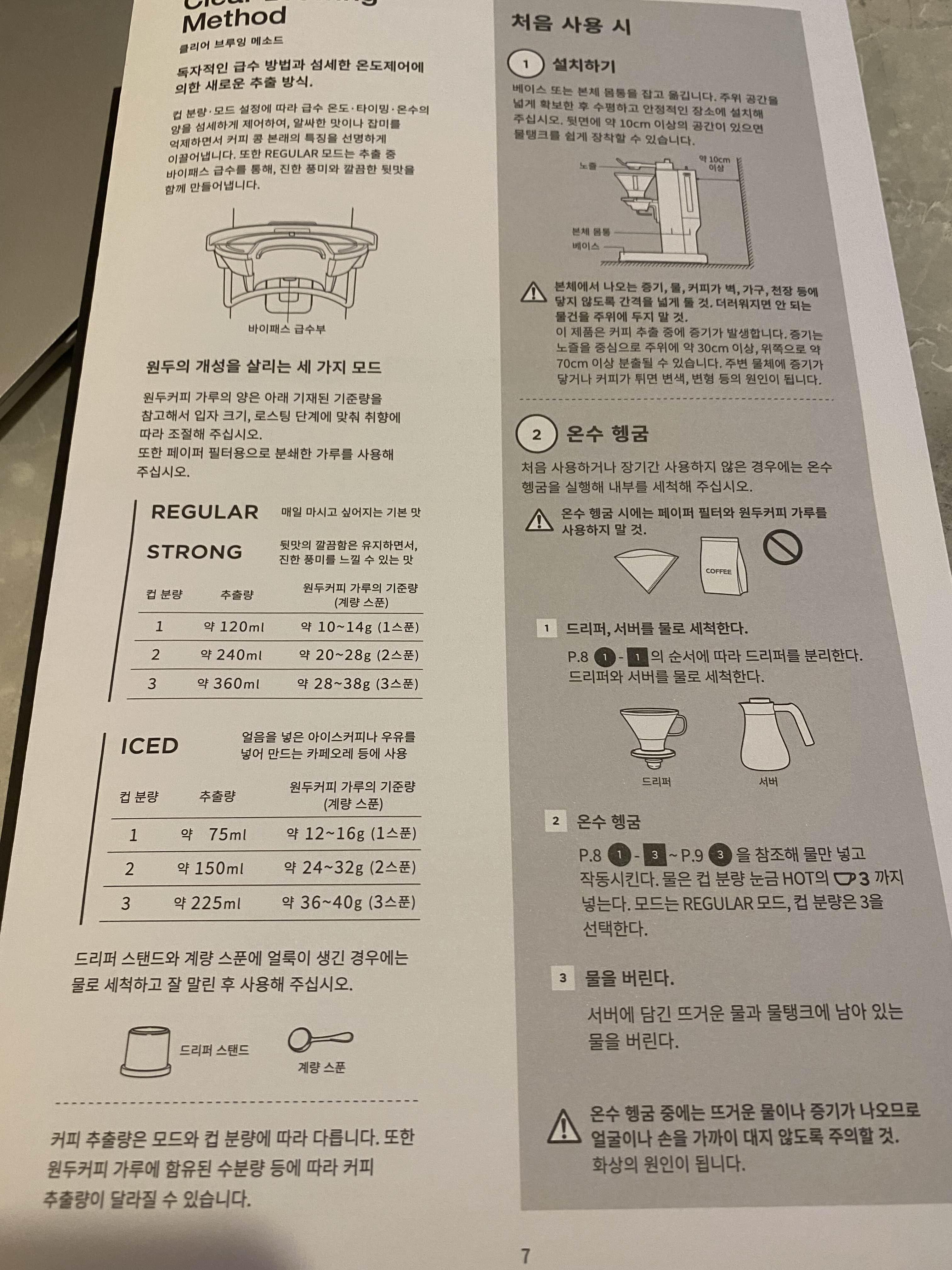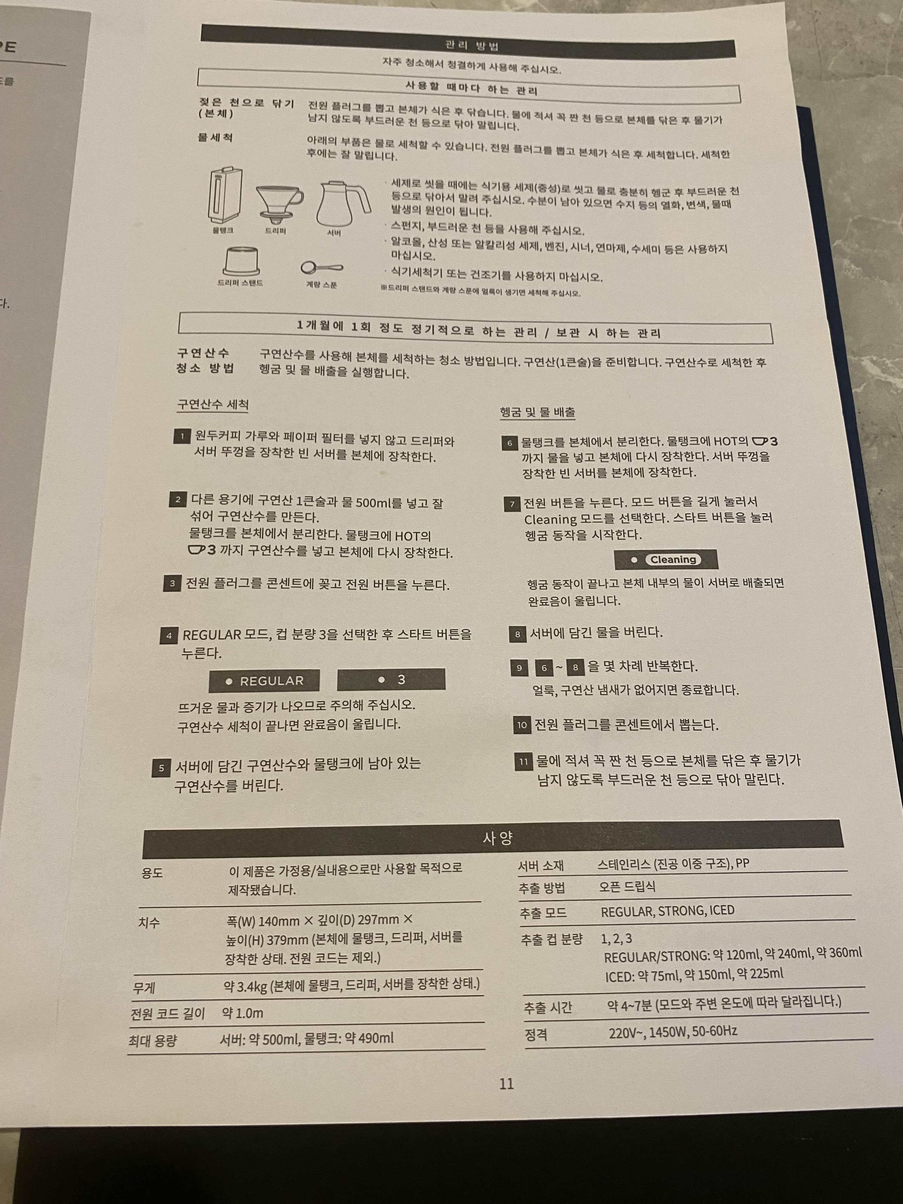 사용설명서에는 처음 사용 시 세척방법 설명되어있다.